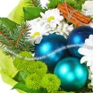 ДЕЛЮКС: хризантема белая - 9шт., роза белая - 5шт., хризантема зеленая (сантини) - 5шт., еловая ветвь - 6шт., корица - 2шт., новогодний декор и зелень, фетр.